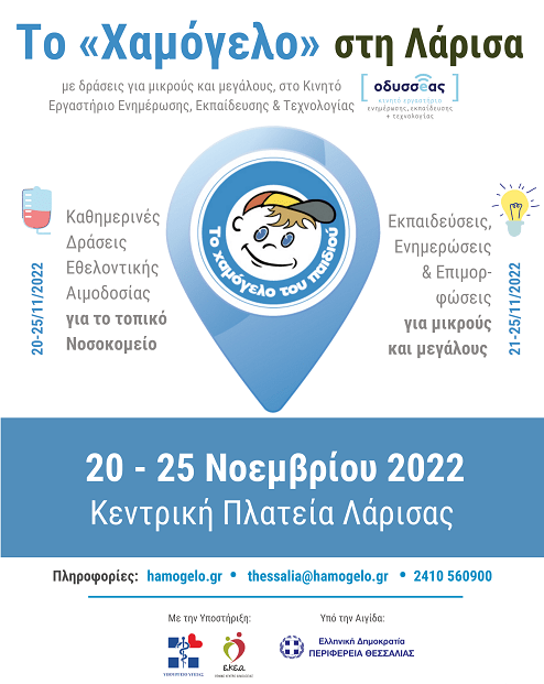 Από την Κυριακή 20 έως και την Παρασκευή 25 Νοεμβρίου 2022, το Κινητό Εργαστήριο Ενημέρωσης, Εκπαίδευσης & Τεχνολογίας «ΟΔΥΣΣΕΑΣ» από τον Οργανισμό «Το Χαμόγελο του Παιδιού» θα βρίσκεται στη Λάρισα (Κεντρική Πλατεία Λάρισας), για να υλοποιήσει δωρεάν εκπαιδευτικές δράσεις πρόληψης για μικρούς και μεγάλους, σε κρίσιμους τομείς που αφορούν τη ζωή και τα δικαιώματα των παιδιών, καθώς επίσης πολυήμερη δράση εθελοντικής αιμοδοσίας για την ενίσχυση των αποθεμάτων αίματος του Τμήματος Αιμοδοσίας του Πανεπιστημιακού Γενικού Νοσοκομείου Λάρισας.