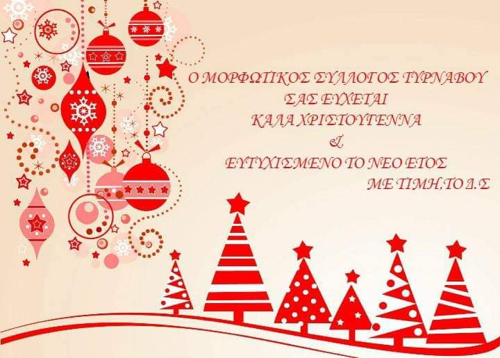 Υγεία, αγάπη, ευτυχία, ελπίδα, όνειρα και χαμόγελα είναι μερικές από τις ευχές του Δ.Σ του Μορφωτικού Συλλόγου Τυρνάβου για τα Χριστούγεννα και τη νέα χρονιά που πλησιάζει.