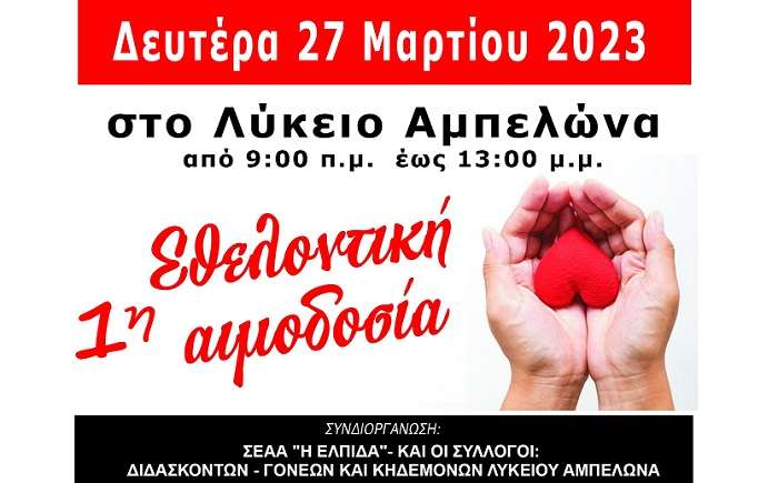 Ο Σύλλογος Διδασκόντων και ο Σύλλογος Γονέων και Κηδεμόνων του Λυκείου Αμπελώνα, σε συνεργασία με το σύλλογο Ελπίδα Αμπελώνα διοργανώνουν την Δευτέρα 27 Μαρτίου 2023 από 9:00 π.μ. έως 13:00 μ.μ. στον χώρο του Λυκείου την 1η Εθελοντική Αιμοδοσία με την συμμετοχή των μαθητών της Γ’ τάξης του Λυκείου, των εκπαιδευτικών του σχολείου, καθώς και των Γονέων- Κηδεμόνων των μαθητών.