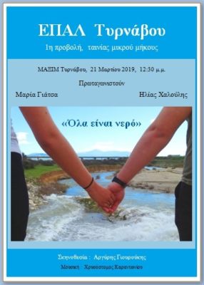 Προβάλλεται για 1η φορά η νέα ταινία του ΕΠΑΛ Τυρνάβου, «Όλα είναι νερό», την Πέμπτη, 21 Μαρτίου, στις 12 30 το μεσημέρι, στο Δημοτικό θέατρο Μαξίμ, στο πλαίσιο εκδήλωσης της ΔΕΥΑΤ Τυρνάβου, για την Παγκόσμια Ημέρα Νερού.