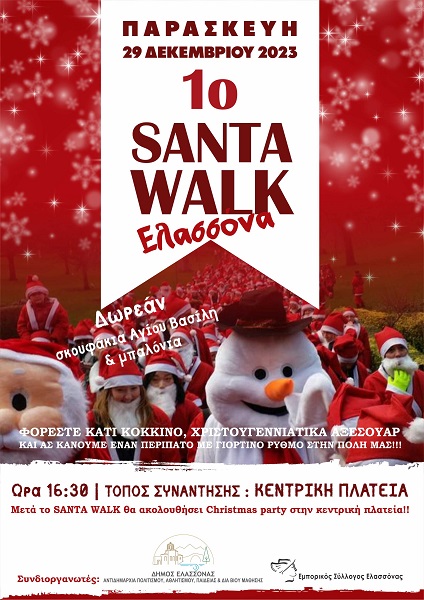 Στην Κεντρική Πλατεία Ελασσόνας την Παρασκευή 29 Δεκεμβρίου 2023 και ώρα 16:30 θα υλοποιηθεί ο «1ος SANTA WALK Ελασσόνας» που διοργανώνεται από τον Εμπορικό Σύλλογο Ελασσόνας με την υποστήριξη της Αντιδημαρχίας Πολιτισμού, Αθλητισμού, Παιδείας και Δια Βίου Μάθησης του Δήμου Ελασσόνας.