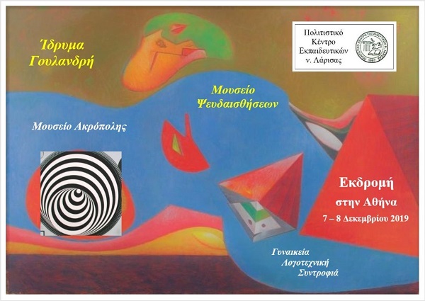 Το Πολιτιστικό Κέντρο Εκπαιδευτικών ν. Λάρισας διοργανώνει 2ήμερη εκδρομή πολιτισμού στην Αθήνα, στις 7 και 8 Δεκεμβρίου 2019. Τα μέλη και οι φίλοι του ΠΟΚΕΛ θα επισκεφθούν το Ίδρυμα Βασίλη & Ελίζας Γουλανδρή (Μουσείο Σύγχρονης Τέχνης), το Μουσείο των Ψευδαισθήσεων (Illusions) και την Ακρόπολη, με το Νέο Μουσείο της, ενώ μπορούν να παρακολουθήσουν μια επιλεγμένη θεατρική