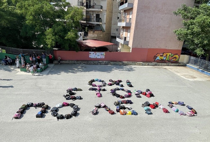 Οι μαθητές/τριες τραγούδησαν, χόρεψαν, απήγγειλαν ποιήματα και στο τέλος “έγραψαν’ με τις τσάντες τους στην αυλή του σχολείου το πάντα επίκαιρο σύνθημα ΌΧΙ ΣΤΟΝ ΠΟΛΕΜΟ.