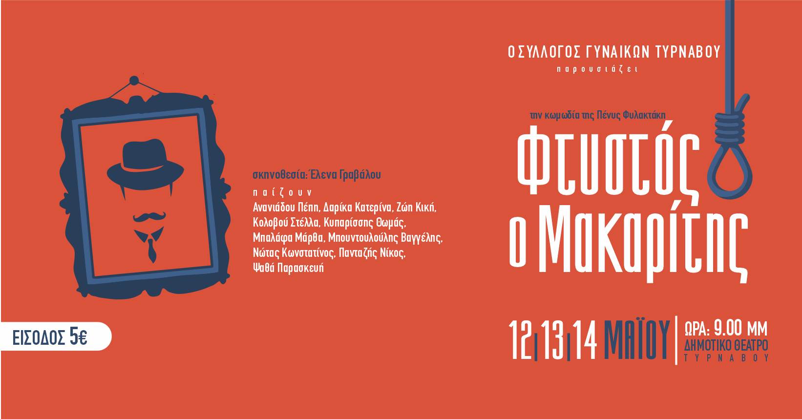 Ο σύλλογος Γυναικών Τυρνάβου παρουσιάζει κωμωδία της Πένυς Φυλακτάκη «Φτυστός ο μακαρίτης», σε 3 παραστάσεις την Παρασκευή, το Σάββατο και την Κυριακή 12, 13 και 14 Μαΐου στο δημοτικό θέατρο Μαξίμ στον Τύρναβο με ώρα έναρξης 9.00 μ.μ.