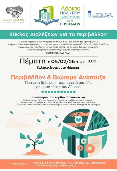 Η επόμενη διάλεξη με τίτλο «Τα πιο πρακτικά βιώσιμα επιχειρηματικά μοντέλα για Επιχειρήσεις και Δήμους» θα πραγματοποιηθεί την Πέμπτη 5 Φεβρουαρίου 2026, στις 18:00, στο Γαλλικό Ινστιτούτο Λάρισας με ομιλήτρια την καθ. Κωνσταντίνα Κοτταρίδη.