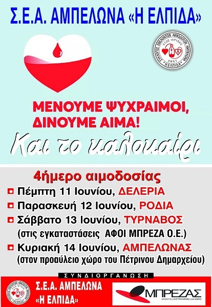 Ο Σύλλογος Εθελοντών Αιμοδοτών Αμπελώνα “Ελπίδα” συνεχίζει τις δράσεις και τις πρωτοβουλίες του με στόχο την ανάδειξη της πανανθρώπινης ιδέας της Εθελοντικής Αιμοδοσίας, την ευαισθητοποίηση της κοινής γνώμης και την προσέλκυση νέων Εθελοντών Αιμοδοτών, ώστε η χώρα μας να επιτύχει την πολυπόθητη αυτάρκεια, σε εθελοντικά προσφερόμενο αίμα.