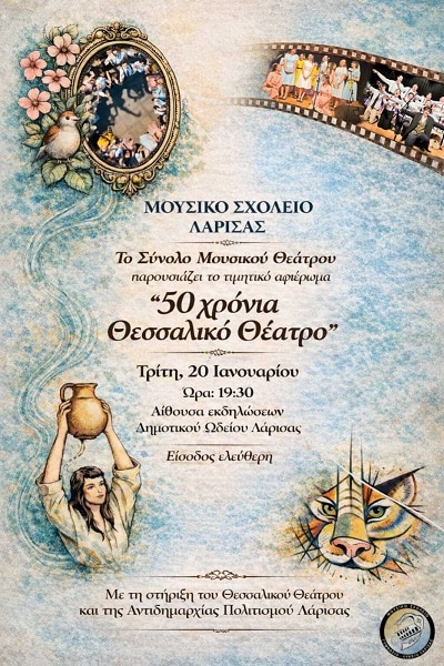 Ένα ιδιαίτερα ενδιαφέρον αφιέρωμα με τίτλο «50 χρόνια Θεσσαλικό Θέατρο», παρουσιάζει αύριο Τρίτη 20 Ιανουαρίου, και ώρα 19:30, στην Αίθουσα εκδηλώσεων του Δημοτικού Ωδείου Λάρισας, το Σύνολο Μουσικού Θεάτρου του Μουσικού Σχολείου Λάρισας, με την υποστήριξη της Αντιδημαρχίας Πολιτισμού του Δήμου Λαρισαίων και του Θεσσαλικού θεάτρου.
