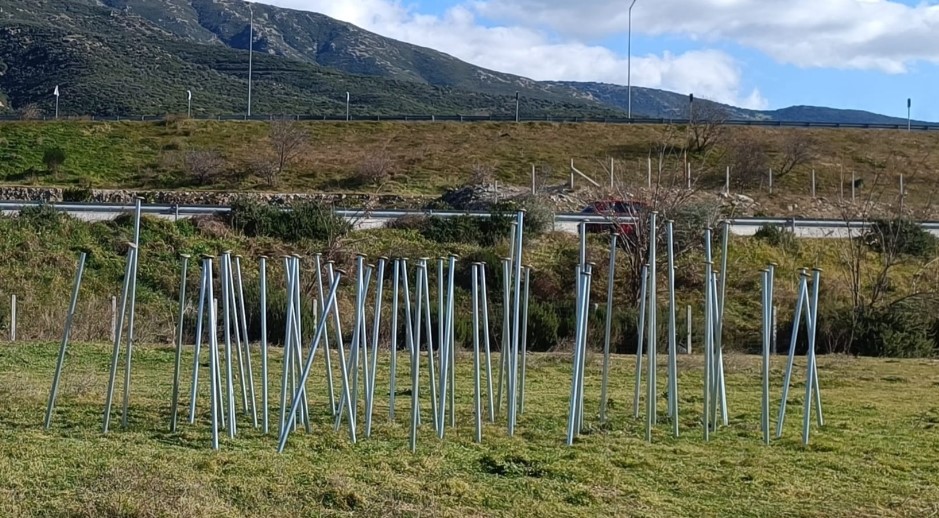 “58 καρφιά στα Τέμπη”. 58 μεταλλικοί σωλήνες 2-2,5μετρων . Εγκατάσταση με διαστάσεις 15x5x2,5μετρα.