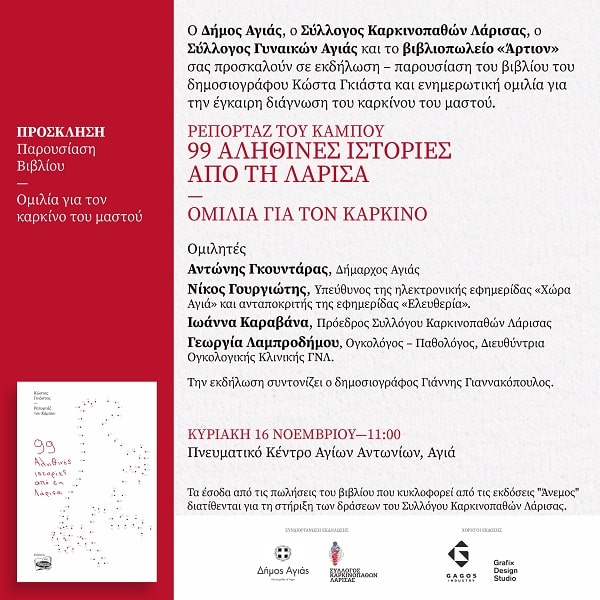 Μια εκδήλωση με διπλή όψη αλλά με ενιαίο κεντρικό μήνυμα την ενημέρωση και την αντιμετώπιση του καρκίνου του μαστού θα πραγματοποιηθεί την Κυριακή 16 Νοεμβρίου στην Αγιά. Ο Δήμος Αγιάς, ο Σύλλογος Καρκινοπαθών Λάρισας, ο Σύλλογος Γυναικών Αγιάς και το βιβλιοπωλείο «Άρτιον» διοργανώνουν στο Πνευματικό Κέντρο των Αγίων Αντωνίων Αγιάς, με την ευγενική υποστήριξη της Αρχιερατικής Περιφέρειας Αγιάς, στις 11.00 π.μ. την παρουσίαση του βιβλίου «Ρεπορτάζ του Κάμπου – 99 Αληθινές ιστορίες από τη Λάρισα», τα έσοδα του οποίου συγκεντρώνονται για τις δράσεις του Συλλόγου Καρκινοπαθών Λάρισας και εκδήλωση ενημέρωσης – ευαισθητοποίησης για τον καρκίνο του μαστού.