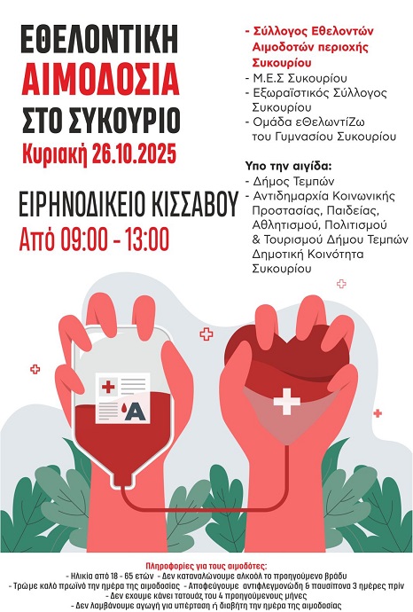 Η αιμοδοσία τέλει υπό την αιγίδα της Αντιδημαρχίας Κοινωνικής Προστασίας, Παιδείας, Πολιτισμού, Αθλητισμού και Τουρισμού του Δ. Τεμπών και της Δημ Κοινότητας Συκουριου.