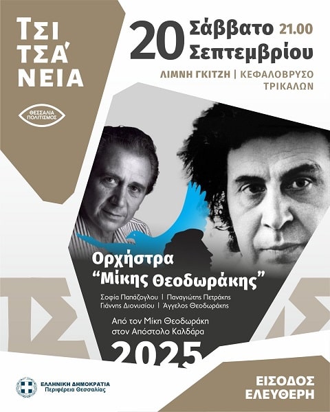 Σε αυτή τη μοναδική συναυλία με τίτλο «Από το Μίκη Θεοδωράκη στον Απόστολο Καλδάρα» που διοργανώνει η Περιφέρεια Θεσσαλίας και η Π.Ε. Τρικάλων, στο πλαίσιο των Τσιτσανείων, αλλά και του εορτασμού «100 χρόνια από τη γέννηση του Μίκη Θεοδωράκη», το Σάββατο 20 Σεπτεμβρίου στο Δημοτικό Γήπεδο Κεφαλόβρυσου, συναντιούνται δύο ξεχωριστοί όσο και διαφορετικοί μουσικοί κόσμοι.