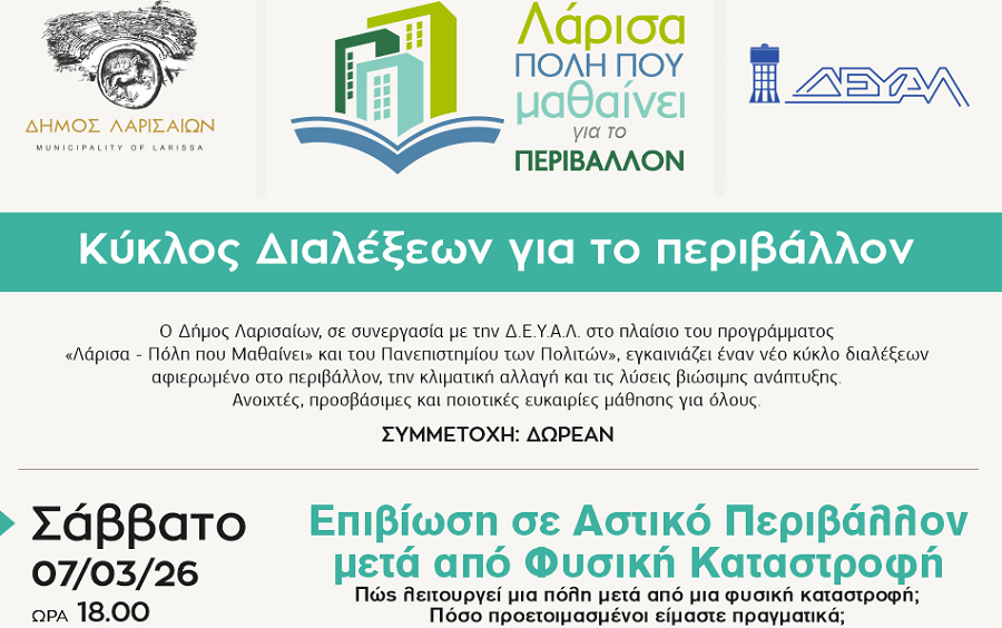 Οι εκδηλώσεις θα πραγματοποιηθούν στο Γαλλικό Ινστιτούτο Λάρισας (Κούμα 28) και απευθύνονται σε κάθε πολίτη που θέλει να κατανοήσει καλύτερα τους κινδύνους του αστικού περιβάλλοντος και να ενισχύσει την προσωπική και συλλογική του ετοιμότητα.