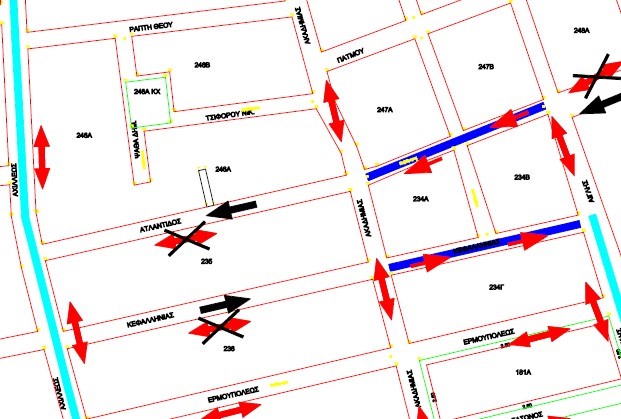 • Μονοδρόμηση της οδού Ατλαντίδος από την οδό Ακαδημίας μέχρι την οδό Αχιλλέως (Ο.Τ. 246Α, Ο.Τ. 235) με φορά κίνησης από οδό Ακαδημίας προς την οδό Αχιλλέως
