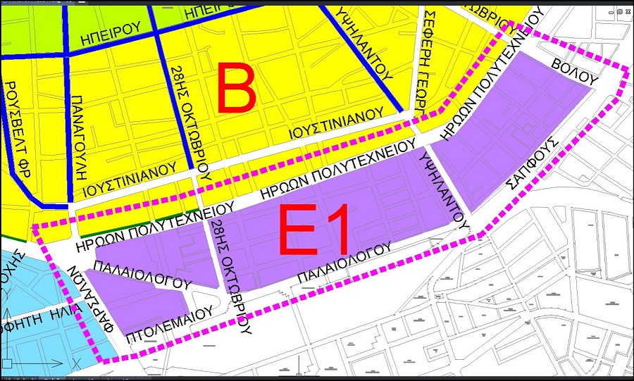 Η Ζώνη Ε1 περικλείεται από τις οδούς: παράπλευρος Φαρσάλων-Ηρ.Πολυτεχνείου-Βόλου-Σαπφούς-Παλαιολόγου-Πτολεμαίου.