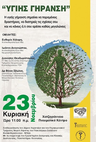 Ημερίδα με θέμα «Υγιής Γήρανση» διοργανώνει η Διεύθυνση Κοινωνικής Πολιτικής και Πρόνοιας του Δήμου Λαρισαίων σε συνεργασία με το Περιφερειακό Τμήμα Νομού Λάρισας του Πανελλήνιου Συλλόγου Φυσικοθεραπευτών – ΝΠΔΔ και με τη συμμετοχή του Εργαστηρίου Διατροφής & Κλινικής Διαιτολογίας του Πανεπιστημίου Θεσσαλίας.