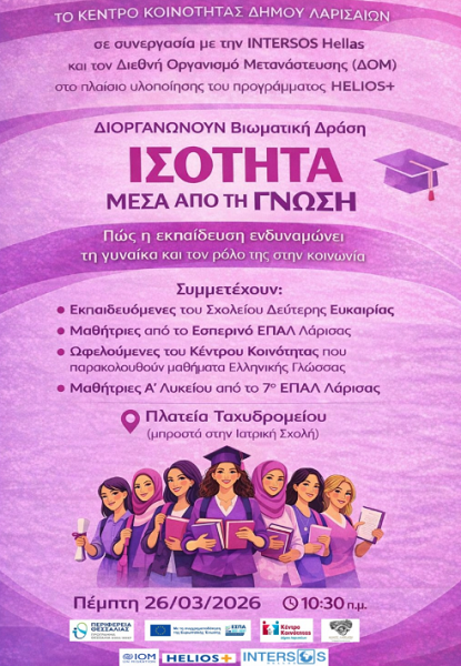 Το Κέντρο Κοινότητας Δήμου Λαρισαίων (συνεχιζόμενες δομές) της Διεύθυνσης Κοινωνικής Πολιτικής και Πρόνοιας, σε συνεργασία με την INTERSOS Hellas και τον Διεθνή Οργανισμό Μετανάστευσης (ΔΟΜ), στο πλαίσιο υλοποίησης του προγράμματος HELIOS+, διοργανώνουν βιωματική δράση με τίτλο «Ισότητα μέσα από τη γνώση», με στόχο την ανάδειξη της σημασίας της εκπαίδευσης στην ενδυνάμωση της γυναίκας και του ρόλου της στη σύγχρονη κοινωνία.
