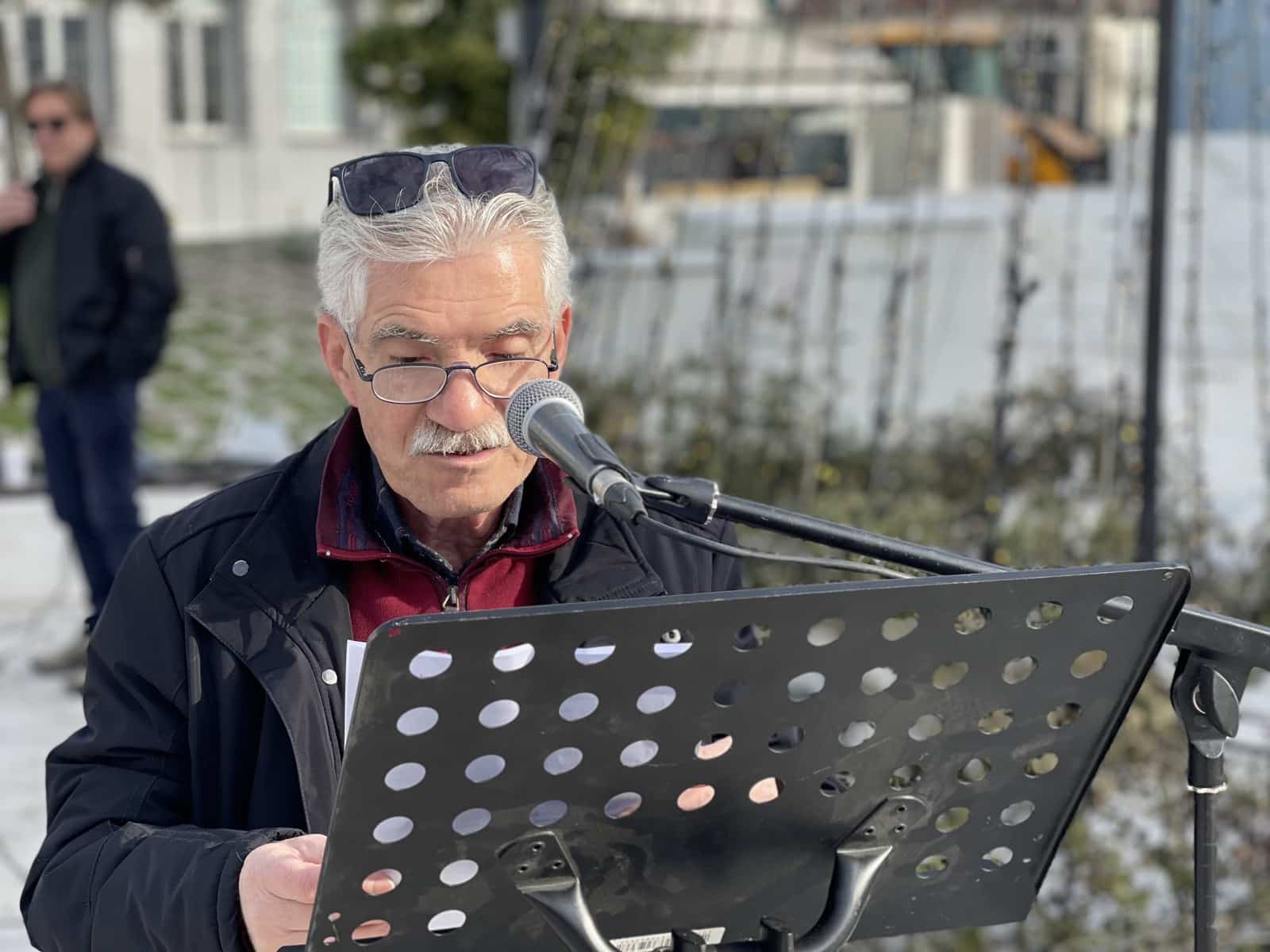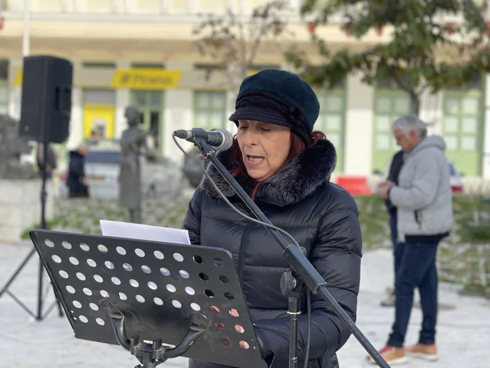Προηγουμένως χαιρετισμό στην εκδήλωση απηύθυναν ο εκπρόσωπος του δ.σ. του Ν.Τ. Λάρισας της ΑΔΕΔΥ Γ. Γκόγκας, ο πρόεδρος του παραρτήματος Τυρνάβου του συνδικάτου Οικοδόμων Γ. Κιτσούλης, ο πρόεδρος του συλλόγου συνταξιούχων ΙΚΑ Π. Φουσέκης και η εκπρόσωπος του Συλλόγου Γυναικών Τ. Κιτσούλη.