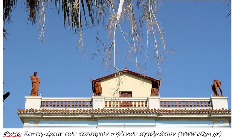 Τέσσερα πήλινα αγάλματα, δύο ανδρών και δύο γυναικών δεσπόζουν στην κορυφή του, προσδίδοντας το χαρακτηριστικό γνώρισμα του και φανερώνει τον λόγο που έμεινε στην ιστορία ως «το σπίτι με τ’ αγάλματα» . Μία μοναδική έκφραση κλασικής αισθητικής που δεν συναντούμε συχνά…