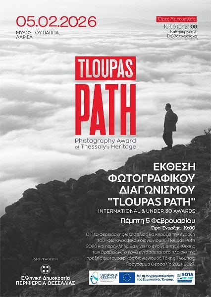 Η Περιφέρεια Θεσσαλίας ανοίγει την έκθεση φωτογραφίας Tloupas PATH – Photography Award of Thessaly’s Heritage, όπου παρουσιάζει τα έργα που διακρίθηκαν στους δύο ετήσιους διαγωνισμούς του θεσμού, στο TLOUPAS PATH INTERNATIONAL AWARD και στο TLOUPAS PATH UNDER 30 AWARD 2025.