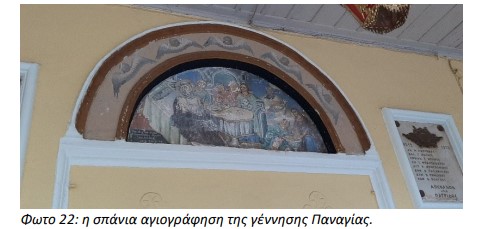 Άνωθεν της κεντρικής εισόδου της εκκλησίας, μια σπάνια εικονογράφηση με θέμα την γέννηση της Παναγίας και ημερομηνία 20-9-1874.