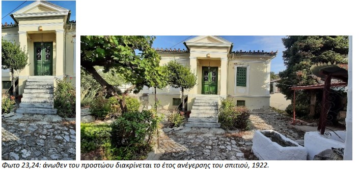 Το σπίτι φέρεται να οικοδομήθηκε το 1922, παρατηρούμε να το στολίζουν τα ακροκέραμα στην κατάληξη της σκεπής, το υπερυψωμένο υπόγειο που χρησίμευε ως χώρος αποθήκευσης, την κεντρική είσοδο στη μέση της πρόσοψης, την ξύλινη εξώθυρα προστατευμένη από το «προστώο» με το αέτωμα στο οποίο υπάρχει αναγεγραμμένο το έτος κατασκευής 1922, την επιβλητική μαρμάρινη σκάλα, την μεγάλη εμπρός αυλή με το καλντερίμι διακοσμημένη με τριανταφυλλιές, θάμνους, κληματαριά, έλατο…