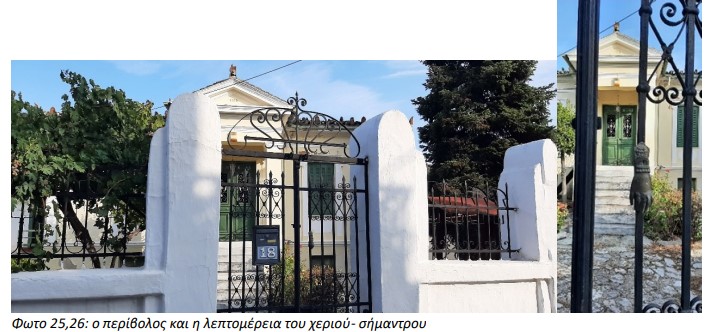 Διακρίνεται το πηγάδι μακριά από το σπίτι, και δίπλα του η πετροκόπανα. Το θαυμάσιο σπίτι προστατεύει στιβαρός περίβολος με μασίφ σιδεριές, που στηρίζονται σε κτισμένες κολώνες. Το πως θα εισέρχονταν ο επισκέπτης όταν η περίτεχνη εξώπορτα της αυλής ήταν κλειστή, την λύση έδινε το μεταλλικό χέρι, δίκην ηλεκτρικού κουδουνιού της τότε εποχής.
