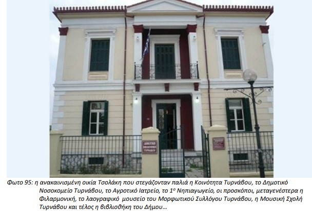 Ο Τύρναβος ευτύχησε όμως να έχει ευνοηθεί από ένα σημαντικό ρεύμα ευεργητών που δώρησαν στον Δήμο σημαντικά περιουσιακα στοιχεία… ανάμεσα στα οποία κτίρια στολίδια που με διάφορους τρόπους ενέταξε στην σημερινή λειτουργία της πόλης…