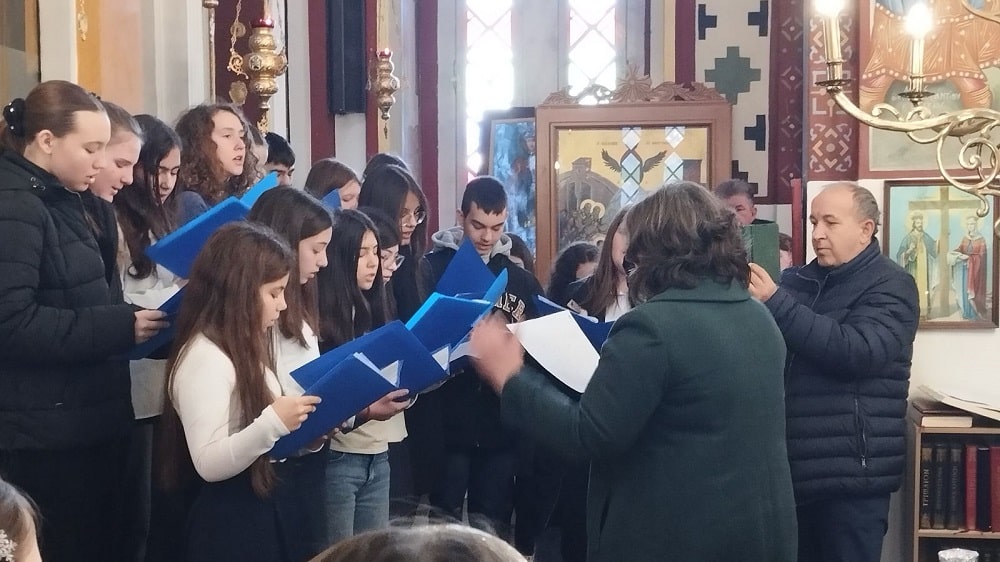 Στον ιερό χώρο αποδόθηκαν μελωδικά από καλλίφωνους ιεροψάλτες του ιερού Ναού ψαλμοί και ύμνοι ακολουθίας της σημερινής εορτής, καθώς και το Απολυτίκιο των Αγίων πριν την ευλογία της αρτοκλασίας από το μουσικό χορωδιακό σύνολο του σχολείου.