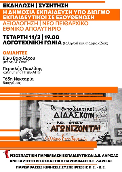 Σε αυτή την κατεύθυνση η Ριζοσπαστική Παρέμβαση Εκπαιδευτικών Δ.Ε. και η Ανεξάρτητη Ριζοσπαστική Παρέμβαση Π.Ε. διοργανώνουν την Τετάρτη 11 Μάρτη, στις 7:00 μ.μ., στη Λογοτεχνική Γωνία (Γαληνού και Φαρμακίδου) εκδήλωση – συζήτηση με θέμα: