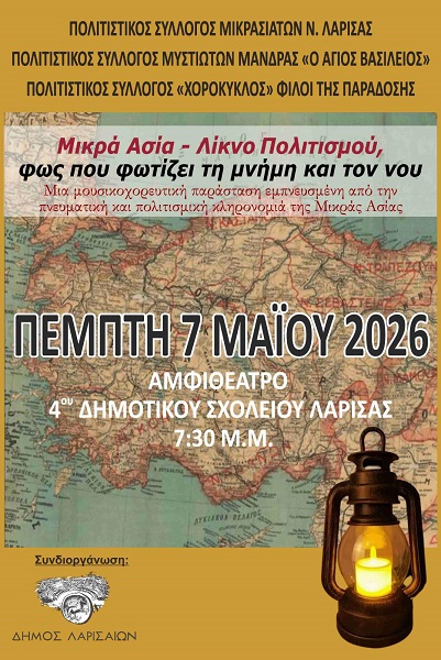 Ο Πολιτιστικός Σύλλογος Μικρασιατών Ν. Λάρισας, ο Πολιτιστικός Σύλλογος Μυστιωτών Μάνδρας «Ο Άγιος Βασίλειος» και ο Χορόκυκλος «Φίλοι της Παράδοσης» διοργανώνουν σε συνεργασία με τον Δήμο Λαρισαίων μια παραδοσιακή μουσικοχορευτική παράσταση εμπνευσμένη από την πνευματική και πολιτισμική κληρονομιά της Μικράς Ασίας.