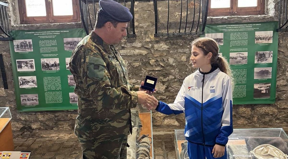 Επίσης ο κ. Μπάκαβος Αστέριος Δ/ντης του Μουσείου και ΥΠΛΓΟΣ (ΠΖ) απέδωσε στην Μαθήτρια της Α’ Γυμνασίου Τόλη Αντωνία το έμβλημα της Ταξιαρχίας για την κατάκτηση του ασημένιου μεταλλίου στο πανευρωπαϊκό Πρωτάθλημα TΑΕΚΒΟΝΤΟ.