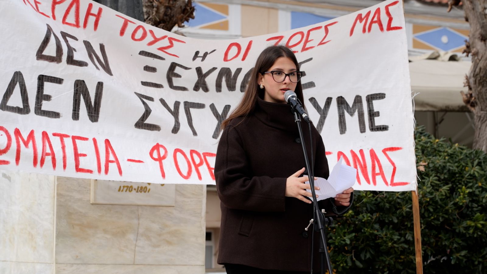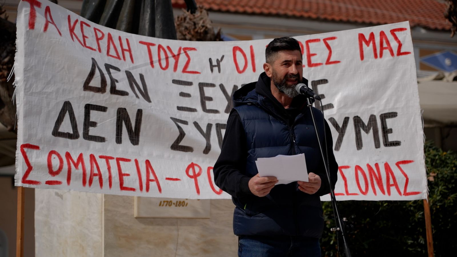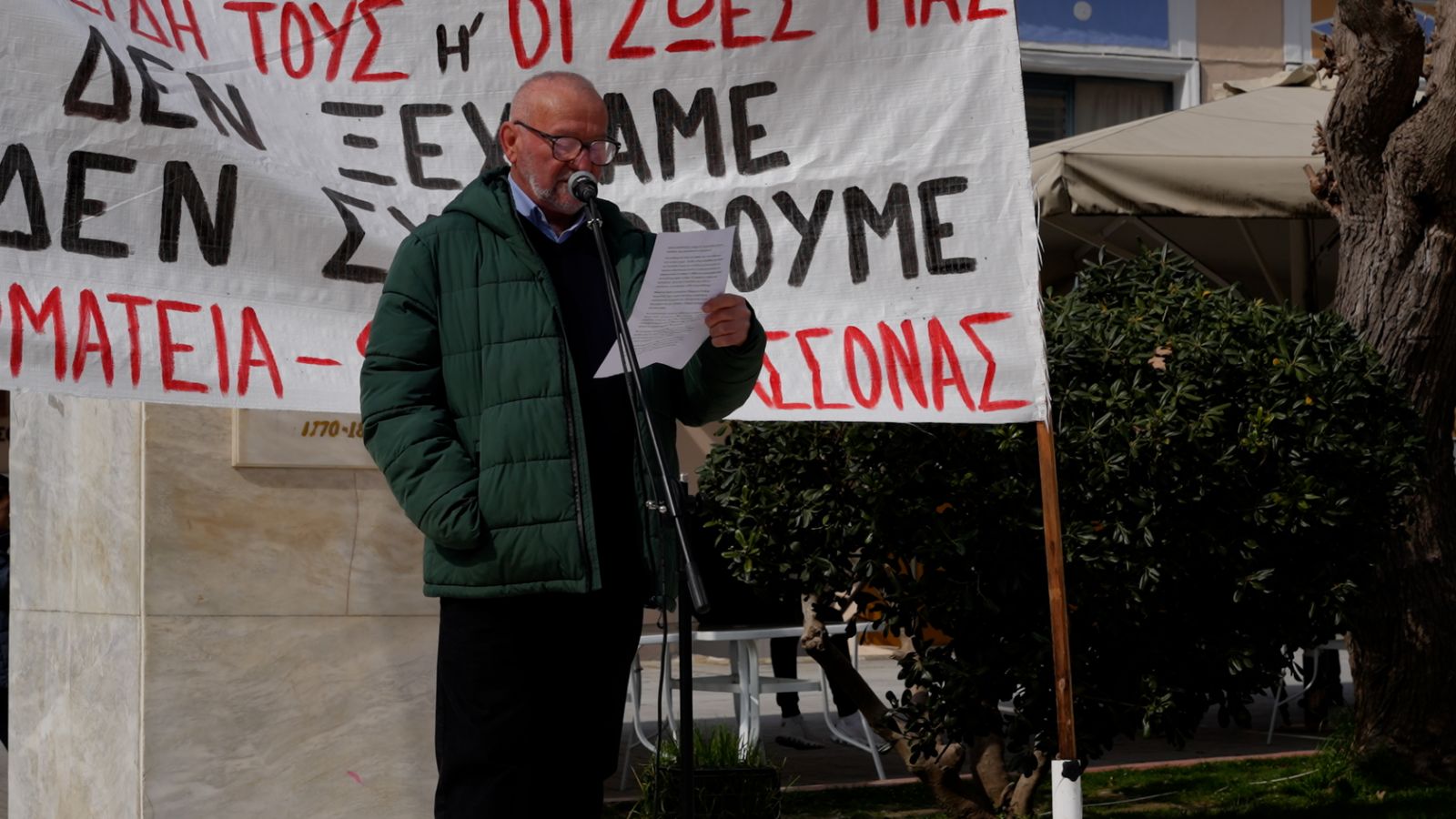 Η συγκέντρωση ξεκίνησε με το μήνυμα του Συλλόγου Συγγενών Θυμάτων των Τεμπών.