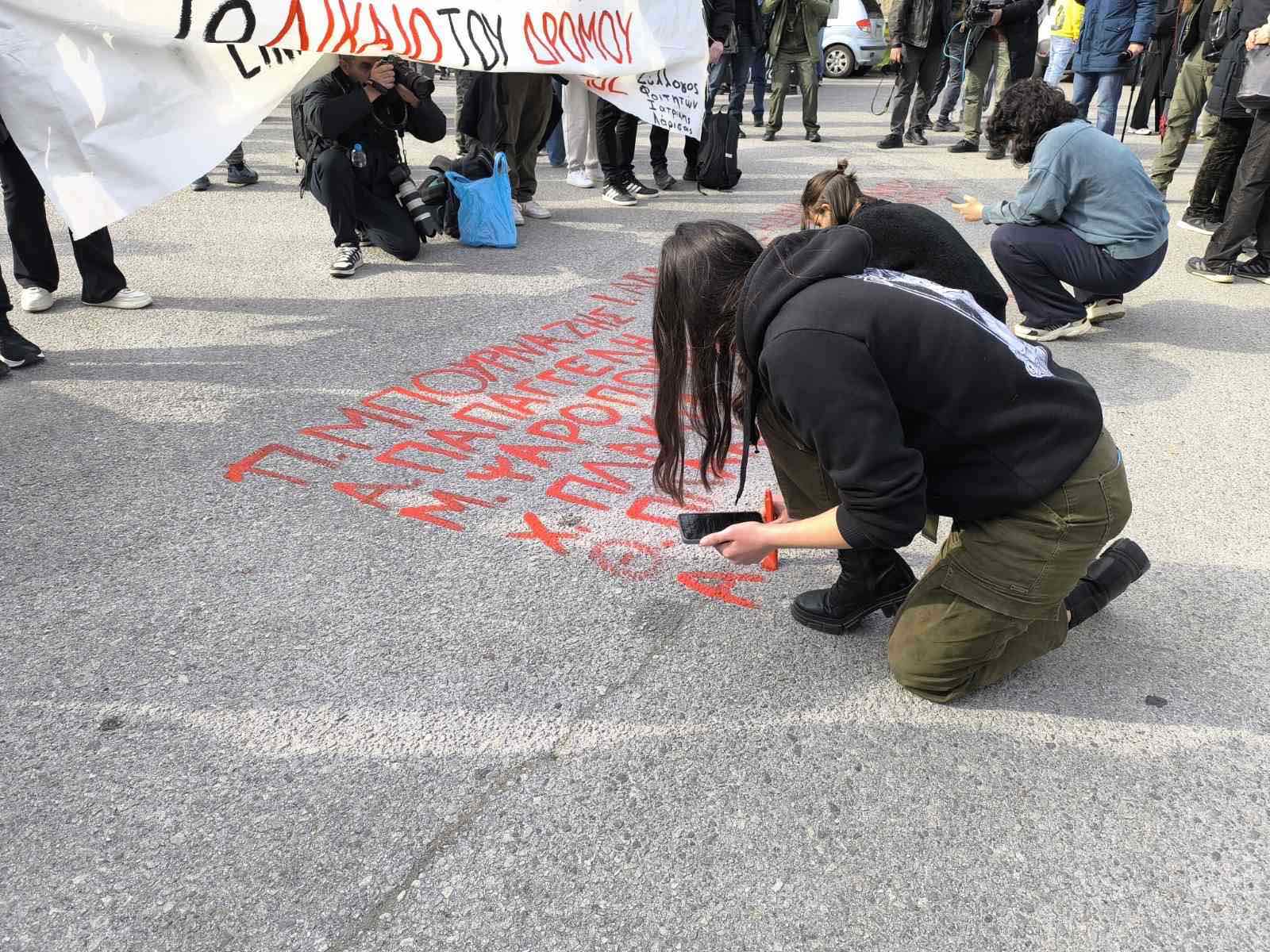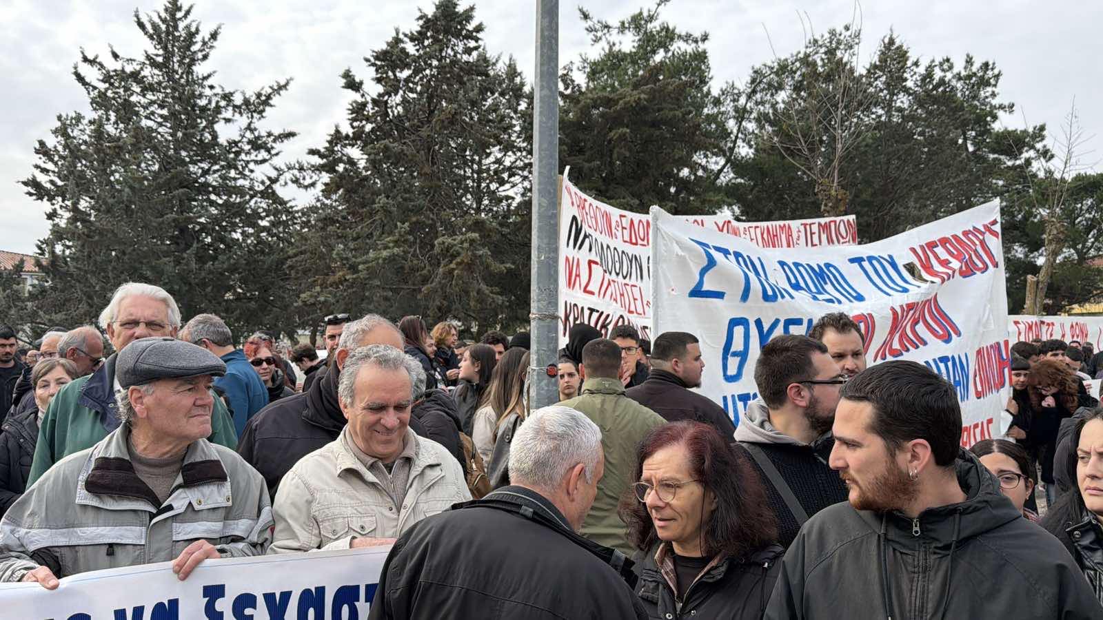 Ενώ το πανό του Εργατικού Κέντρου με το σύνθημα «Όλων των νεκρών είμαστε η φωνή, το έγκλημα στα Τέμπη δεν θα συγκαλυφθεί»:έδινε τον τόνο.