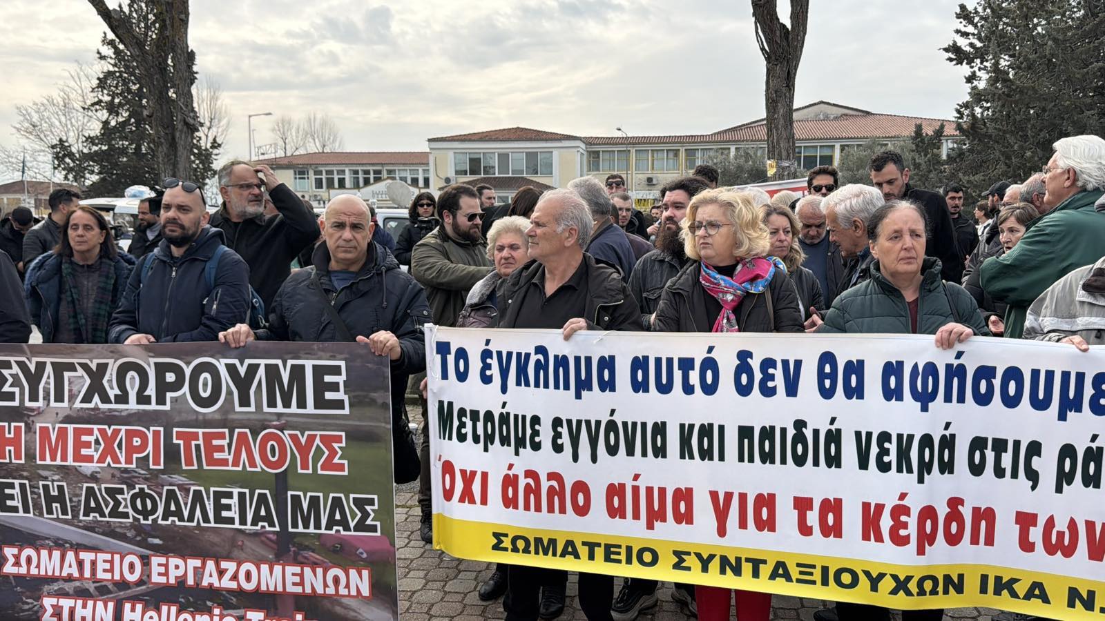 Εξω από το συνεδριακό κέντρο του ΤΕΙ είχαν συγκεντρωθεί από νωρίς το πρωί πολίτες για να συμπαρασταθούν στους συγγενείς των θυμάτων και στους τραυαμτίες απαιτώντας δικαιοσύνη.