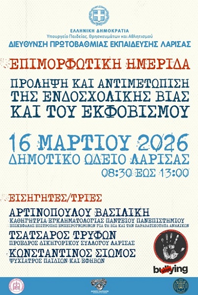 “Πρόληψη και Αντιμετώπιση της Ενδοσχολικής Βίας και του Εκφοβισμού”, η οποία θα πραγματοποιηθεί στο Δημοτικό Ωδείο Λάρισας, τη Δευτέρα 16/3/2026 και ώρα 8:30 π.μ.-12:30 μ.μ..
