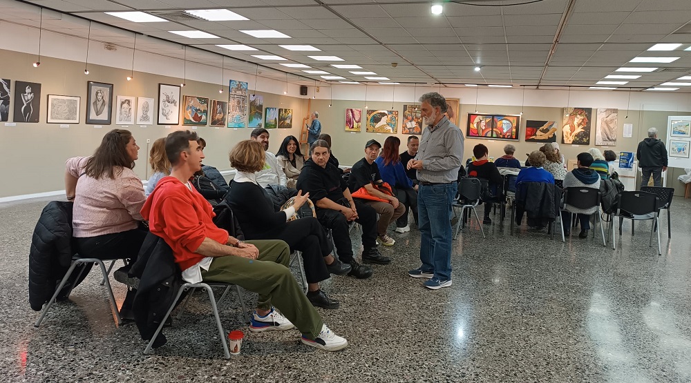 Τους μαθητές υποδέχθηκε ο πρόεδρος του Συλλόγου, κ. Γιάννης Γεωργιάδης, ο οποίος τους καλωσόρισε θερμά και τους παρουσίασε το γενικό πλαίσιο της έκθεσης, πραγματοποιώντας παράλληλα μια σύντομη αλλά ουσιαστική ξενάγηση στα έργα.