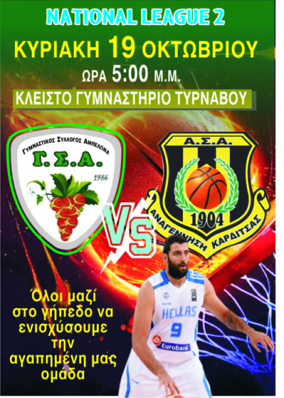 Αποφασισμένοι να πάρουν την πρώτη τους νίκη μετά το ατυχές αποτέλεσμα της προηγούμενης αγωνιστικής με τον Φίλιππο Βέροιας εκτός έδρας, είναι προπονητές και παίκτες της ομάδας μπάσκετ του Γυμναστικού Συλλόγου Αμπελώνα που υποδέχονται στις 5,00 μ.μ. της Κυριακής στο κλειστό γυμναστήριο του Τυρνάβου την ομάδα μπάσκετ της Αναγέννησης Καρδίτσας στο πρώτο θεσσαλικό ντέρμπι, της Basket National League 2.