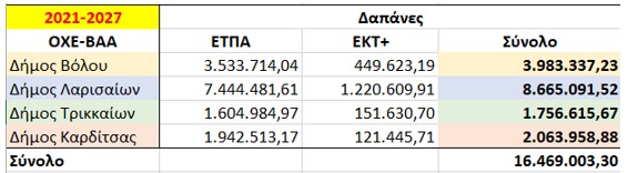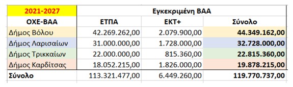Ο συνολικός προϋπολογισμός των ΣΒΑΑ των 4 πρωτευουσών των ΠΕ Θεσσαλίας για το ΠΕΠ «Θεσσαλία» 2021-2027 αγγίζει τα 120 εκ. ευρώ, ποσό το οποίο αντιστοιχεί σε ποσοστό πάνω από το 17% των πόρων του ΕΤΠΑ. Συγκεκριμένα, οι προϋπολογισμοί ανά πρωτεύουσα ΠΕ αναλύονται σε 44,35 εκ. € για τη Λάρισα, 32,73 εκ. € για το Βόλο, 22,82 εκ. € για τα Τρίκαλα και 19,88 εκ. € για την Καρδίτσα.