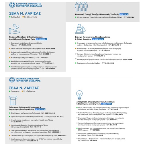 Η Στρατηγική Βιώσιμης Ανάπτυξης (ΣΒΑΑ) του Δήμου Λαρισαίων προϋπολογισμού 44.349.162€ εγκρίθηκε με την με αρ. 4301-12/07/2024 Απόφαση Περιφερειάρχη Θεσσαλίας. Η περιοχή παρέμβασης καλύπτει το σύνολο της λειτουργικής αστικής περιοχής της Λάρισας, έκτασης 20,26 km² και πληθυσμού 146.595 κατοίκων (2021). Περιλαμβάνει έργα που αφορούν στους τομείς που αποτυπώνονται στους πίνακες που ακολουθούν: