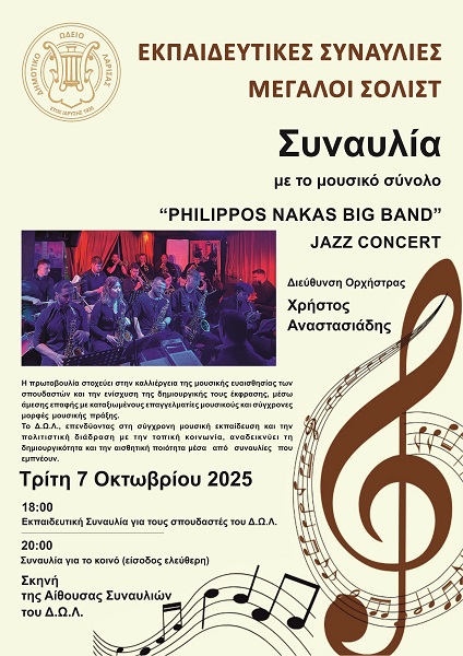 Μια ξεχωριστή δράση αφιερωμένη στην τζαζ μουσική και την ιστορική εξέλιξη της Big Band, διοργανώνεται την Τρίτη 7 Οκτωβρίου 2025, στις 20:00, στην αίθουσα συναυλιών του Δημοτικού Ωδείου Λάρισας, με δωρεάν είσοδο για το κοινό και στις 18:00, για τους σπουδαστές του Δ.Ω.Λ.