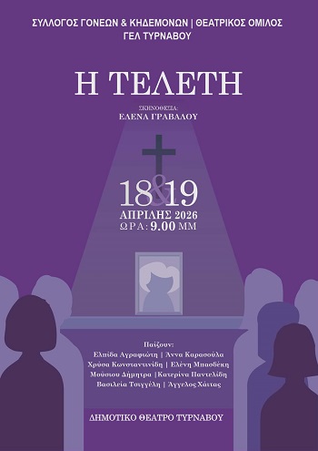 Τη «μαύρη» κωμωδία του Παύλου Μάτεσι «Η Τελετή» ανεβάζει φέτος η θεατρική ομάδα του ΓΕΛ ΤΥρνάβου σε συνεργασία με το σύλλογο Γονέων και Κηδεμόνων του σχολείου και σε σκηνιθεσία Ελενας Γράβαλου, για δύο παραστάσεις το Σάββατο και την Κυριακή 18 και 19 Απριλίου, στο δημοτικό θέατρο «Μαξίμ» Τυρνάβου. Η