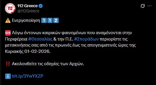 Μήνυμα του 112 για επικίνδυνα καιρικά φαινόμενα σε όλη τη Θεσσαλία έφτασε στα κινητά όλων των κατοίκν της περιοχής με τη σύσταση να αποφύγουν την Κυριακή τις μετακινήσει.