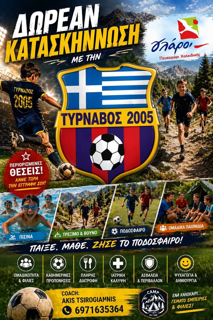Η Ακαδημία Τυρνάβου 2005 δίνει την ευκαιρία σε ΟΛΑ τα παιδιά του Τυρνάβου — μαζί με τα παιδιά της ακαδημίας — να ζήσουν μια καλοκαιρινή κατασκήνωση γεμάτη δράση, χαμόγελα και στιγμές που δεν ξεχνιούνται.