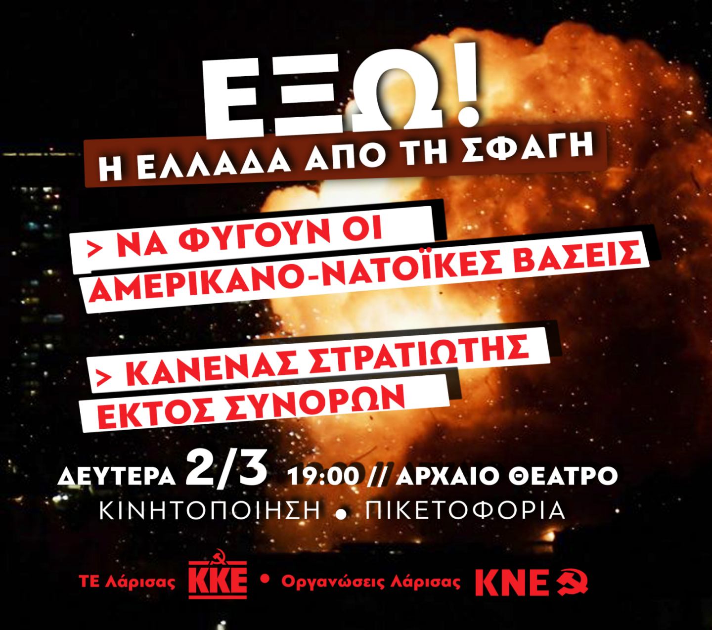 Με σύνθημα «Έξω η Ελλάδα από την σφαγή! » η ΤΕ Λάρισας του ΚΚΕ καλεί τον λαό της πόλης σε επαγρύπνηση και σε μαζική συμμετοχή σημειώνοντας πως «τώρα χρειάζεται ο λαός μας να δυναμώσει την πάλη του για καμία εμπλοκή στους επικίνδυνους ιμπεριαλιστικούς ανταγωνισμούς, να εκφράσει την αλληλεγγύη του στον ιρανικό λαό και όλους τους λαούς που είναι θύματα της ιμπεριαλιστικής βαρβαρότητας, απαιτώντας: