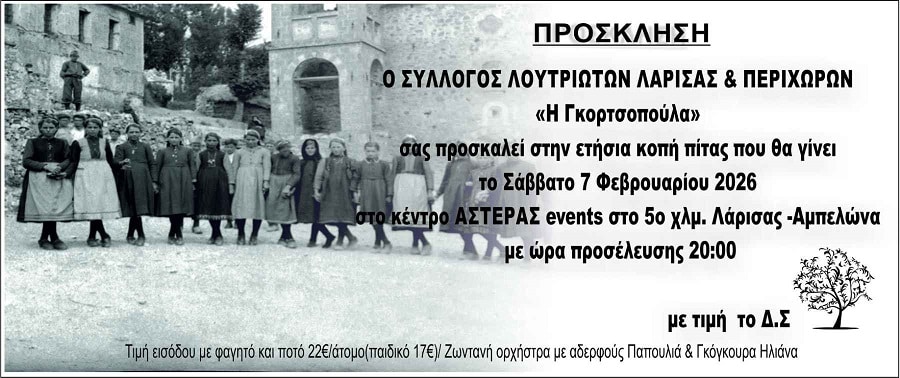 Ο Σύλλογος Λουτριωτών Λάρισας και Περιχώρων η Γκορτσοπούλα διοργανώνει την ετήσια εκδήλωση κοπής της πίτας το Σάββατο 7 Φεβρουαρίου στις 8.00 μ.μ. στο κέντρο Αστέρας στο 5ο χλμ. Λάρισας – Αμπελώνα.