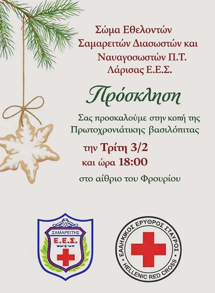 Το Σώμα Εθελοντών Σαμαρειτών, Διασωστών & Ναυαγοσωστών Π.Τ. Λάρισας του Ελληνικού Ερυθρού Σταυρού σας προσκαλεί στην εκδήλωση κοπής της Πρωτοχρονιάτικης Βασιλόπιτας του!