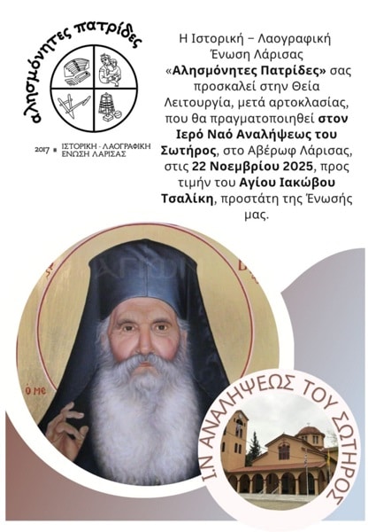 Το Διοικητικό Συμβούλιο της Ιστορικής -Λαογραφικής Ένωσης Λάρισας “Αλησμόνητες Πατρίδες” αποφάσισε να καθιερώσει ετήσια Θεία Λειτουργία και Ιερή Αρτοκλασία στις 22 Νοεμβρίου, προς τιμήν του Αγίου Ιακώβου Τσαλίκη, προστάτη της Ένωσης.