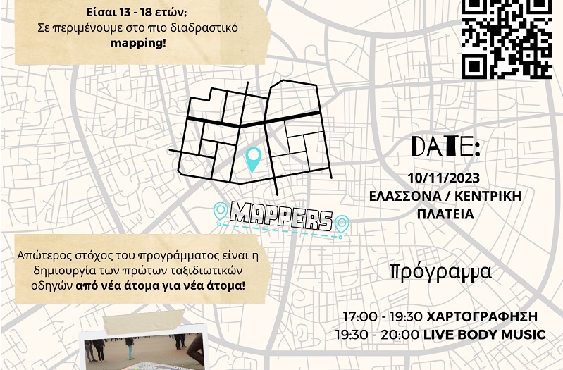 Είσαι 13-18 ετών; Μένεις στη Ελασσόνα; Το πρόγραμμα Mappers σε περιμένει στην Κεντρική πλατεία της πόλης για το πιο διαδραστικό mapping, την Παρασκευή 10 Νοεμβρίου 2023, με την ΑΜΚΕ Πολύχρωμες Νομάδες.