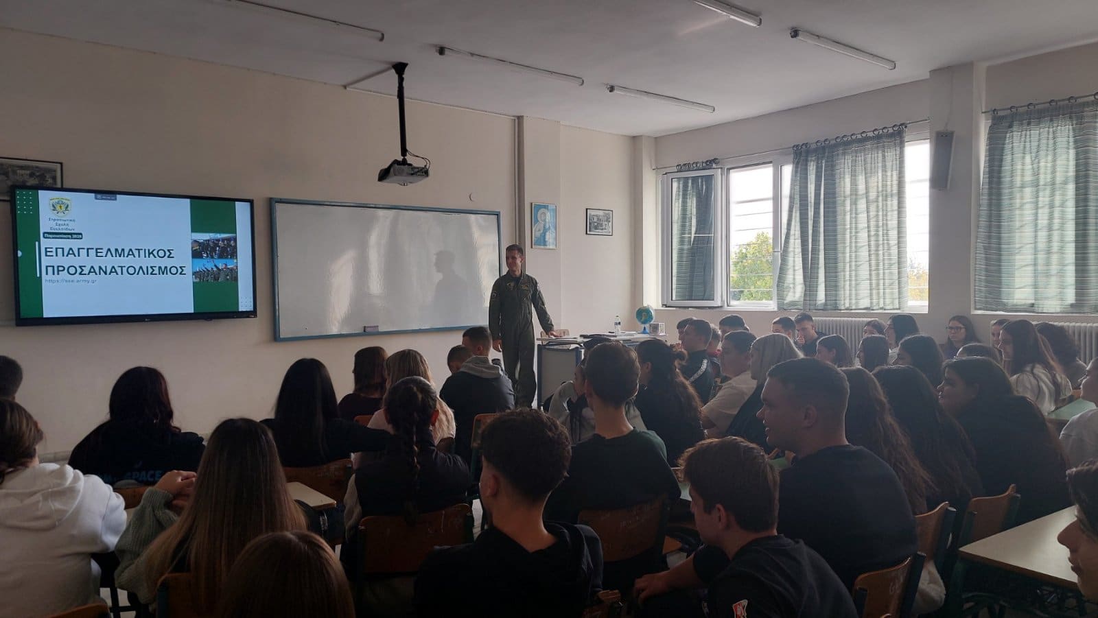 Στο πλαίσιο του Επαγγελματικού Προσανατολισμού, την Τρίτη 4 Νοεμβρίου 2025, από τις 09:00 έως τις 12:00, το Γενικό Λύκειο Τυρνάβου Λάρισας φιλοξένησε εκπροσώπους της 1ης Στρατιάς / EU-OHQ «ΑΧΙΛΛΕΑΣ» και της 1ης ΤΑΞΑΣ, οι οποίοι πραγματοποίησαν ενημερωτική διάλεξη σε μαθητές σχετικά με τη Στρατιωτική Σχολή Ευελπίδων (ΣΣΕ) και τη Σχολή Μονίμων Υπαξιωματικών (ΣΜΥ), καθώς και για τις επαγγελματικές προοπτικές στον Στρατό Ξηράς.