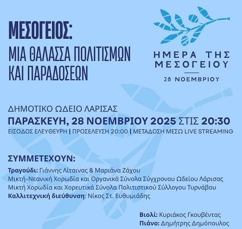 Το Σύγχρονο Ωδείο Λάρισας και ο Πολιτιστικός Σύλλογος Τυρνάβου συμμετέχουν σε αυτή τη μεγάλη γιορτή του πολιτισμού. Στις 28 Νοεμβρίου στο Δημοτικό Ωδείο Λάρισας (ώρα 20:30), θα ενώσουμε τις φωνές μας με σύνολα από όλες τις χώρες της Μεσογείου σε μία ξεχωριστή μουσική παράσταση με ελεύθερη είσοδο που ξεπερνά τα εμπόδια και μας συνδέει με τρόπους που οι λέξεις δεν μπορούν. Η Ημέρα της Μεσογείου, με την υποστήριξη του Ιδρύματος Anna Lindh Foundation, ενώνει ήχους από την παράδοση, τις «ρίζες» των λαών, προβάλλοντας τις αληθινές ιστορίες και τους δεσμούς που ενώνουν τις κοινότητές μας.